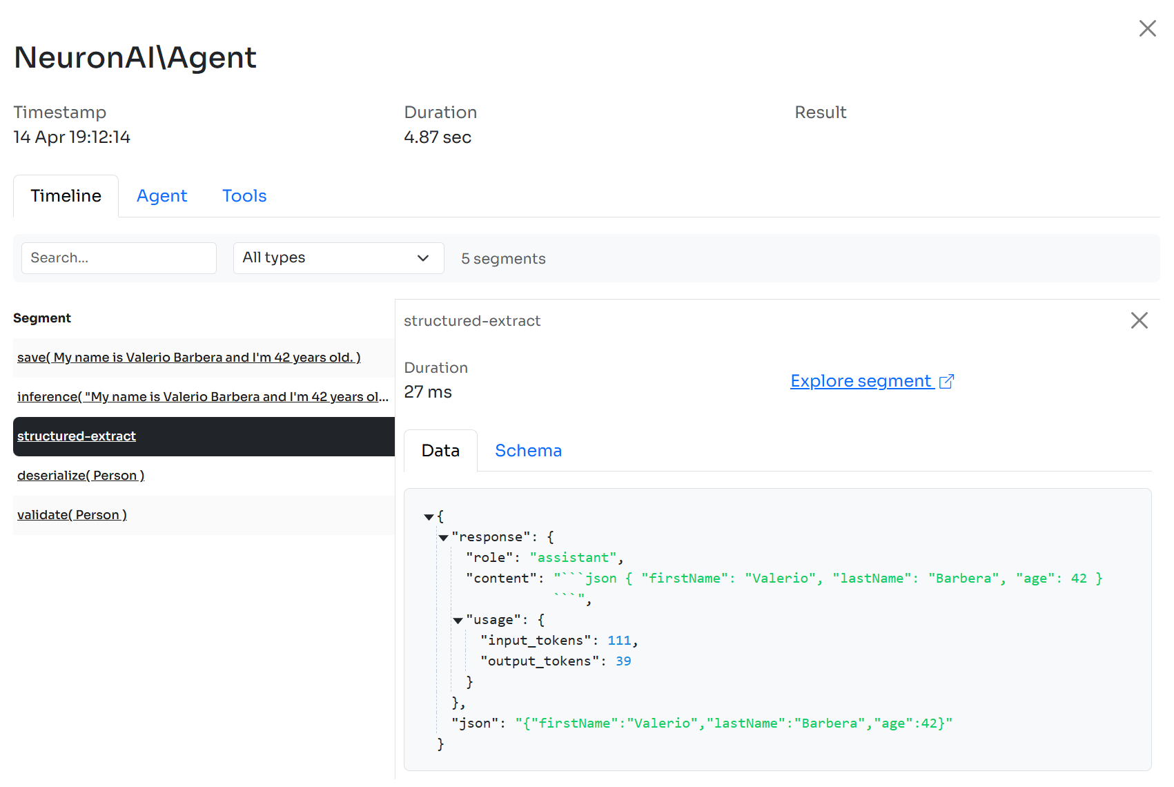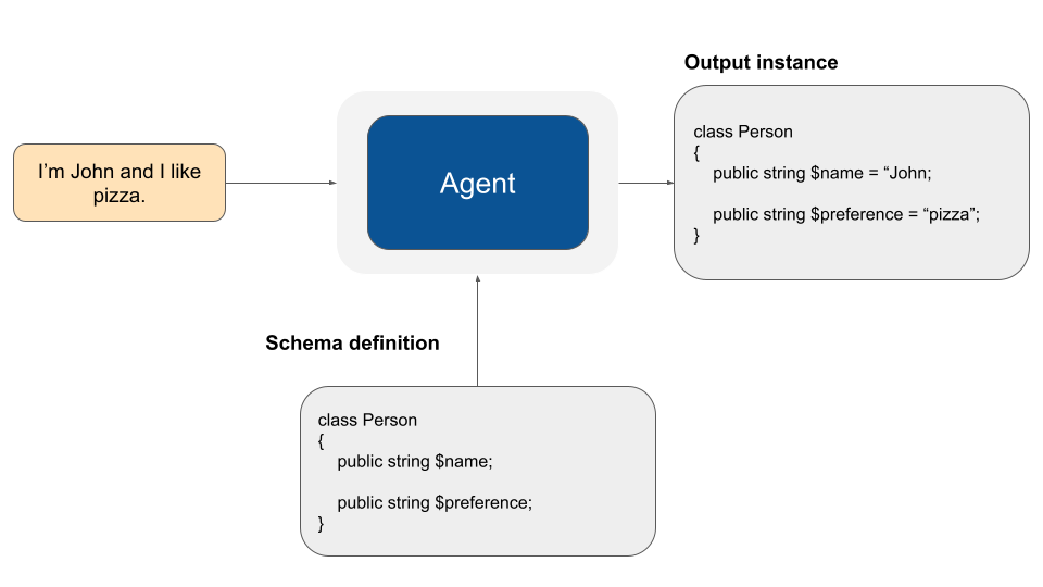 Neuron generates the corresponding JSON schema from the PHP object to instruct the underlying model about your required data format. Then the agent parse the LLM output to extract data and returns an object instance filled with appropriate values: