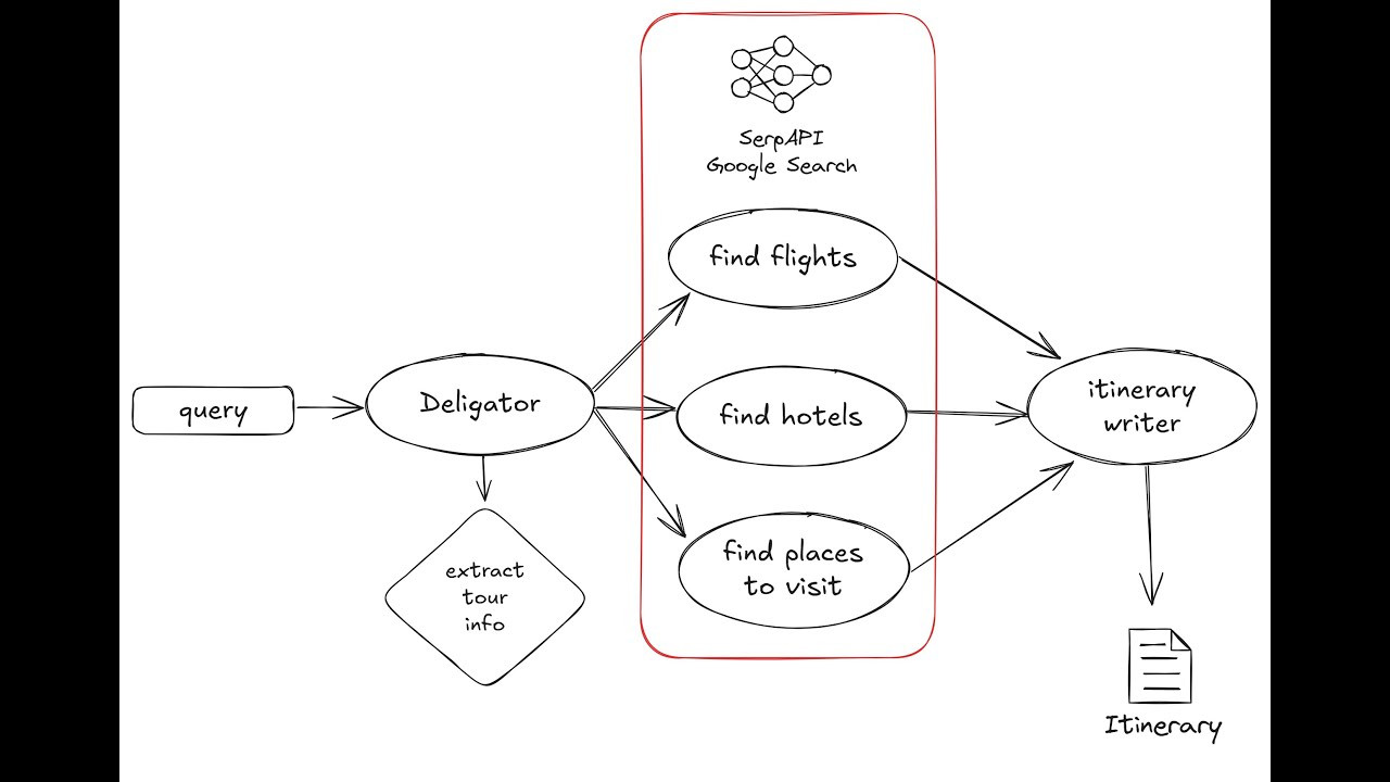 Delegator: Generates single reports for flights, hotels, and places to visit